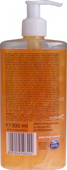 Met deze Chase handzeep van Spin Masters wordt handen wassen pas echt een feestje! Een ideaal cadeau aan alle Paw Patrol fans! De handzeep zit in een handige pomp met een inhoud van 300 ml en heeft een vrolijke kleur. Specificaties: Kleur: oranje Geslacht: junior Materiaal: kunststof Inhoud: 300 ml Leeftijd: vanaf 3 jaar Ingrediënten: Water, sodium laureth sulfate, sodium chloride, stearamide mea, parfum, methylchloroisothazolinone, methylisothiazolinone, amandelolie, glycereth-8 esters, panthenol, tocopheryl acetate, citric acid, CI19140, CI 16522, CI 42090