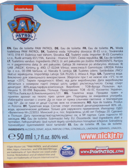 Laat kinderen kennis maken met deze heerlijke eau de toilette van Spin Master. Op eau de toilette staat verschillende honden van Paw Patrol afgebeeld. Een vrolijk geurtje voor alle kinderen. Zet dit 50 ml flesje in de badkamer, slaapkamer of geef het als cadeautje. Specificaties: Kleur eau de toilette: transparant Kleur verpakking: blauw Geslacht: junior Materiaal fles: glas Inhoud: 50 ml Alcoholpercentage: 80% Leeftijd: vanaf 3 jaar Ingrediënten: Alcohol denat, water, parfum, citral, citronellol, limonene, geraniol, linalool